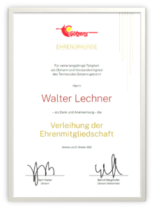 Für seine besonderen Verdienste um den Tennisclub Götzens hat Walter Lechner auf der diesjährigen Jahreshauptversammlung die Ehrenmitgliedschaft verliehen bekommen. Insbesondere als Gründungsmitglied, Unterstützer und unermüdlichen Kämpfer für den Nachwuchs kennen wir ihn. Für seine langjährige Tätigkeit als Obmann und Vorstandsmitglied unseres Tennisclubs wollen wir einfach nur DANKE sagen!